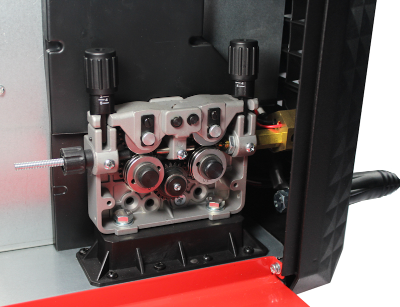 Poprzez zastosowanie 4-rolkowego podajnika drutu urządzenie radzi sobie bardzo dobrze z 5 metrowymi uchwytami spawalniczymi.