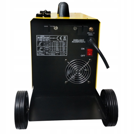 - Podwozie jezdne - urządzenie wyposażono podwozie jezdne, dzięki któremu bardzo łatwo można przemieszczać spawarkę. Posiada również półkę na butlę