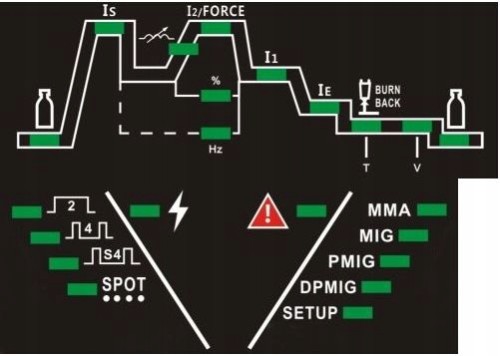 Czytelny i prosty w obsłudze cyfrowy panel sterowania umożliwia dokładną regulację parametrów spawania takich jak :