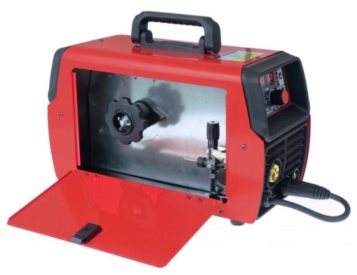 - Czytelny wyświetlacz LCD - szybka regulacja synergiczna parametrów spawania : prąd spawania, napięcie spawania, prędkość podawania drutu