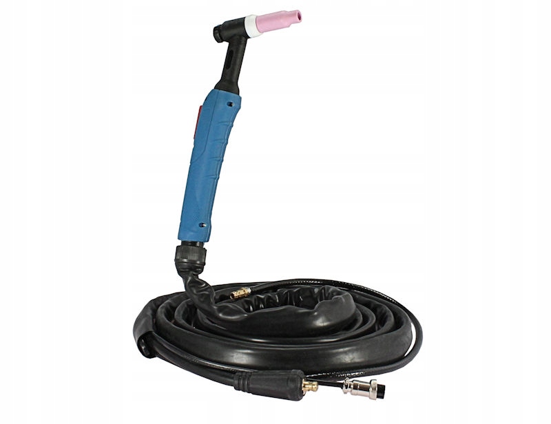W komplecie znajduje się uchwyt do spawania metodą TIG chłodzony gazem oraz przewód masowy z zaciskiem kleszczowym.