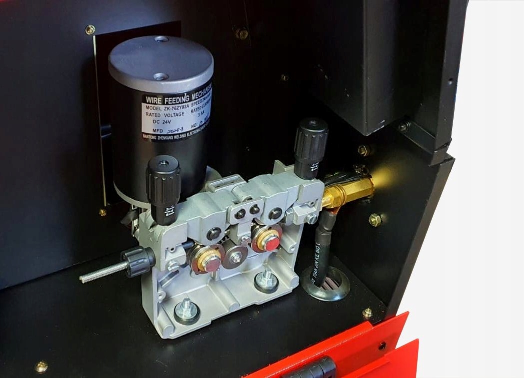 - Profesjonalny podajnik drutu: 4-rolkowy, zapewnia stabilne podawanie spoiwa oraz umożliwia stosowanie długich uchwytów spawalniczych