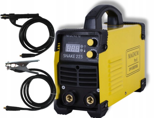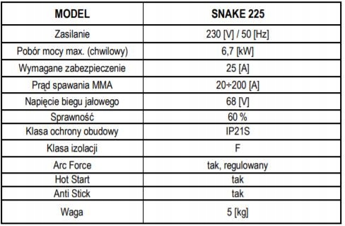 Urządzenie inwerterowe SNAKE 225 jest lekkim, przenośnym źródłem energii. Służy do spawania elektrodami otulonymi różnych gatunków stali w tym zwykłych, nierdzewnych, żaroodpornych oraz żeliwa. Przeznaczone jest do pracy w warunkach terenowych i wykonywania wszelkiego rodzaju prac naprawczych. Urządzenie charakteryzuje się dużą sprawnością 200 A/60%. Posiada znakomitą charakterystykę łuku dla elektrod rutylowych i zasadowych.